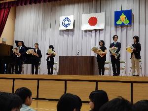 3月末まで本校で勤務していた先生方を招いて離任式を行いました。離任式では代表児童の作文と花束のプレゼントを行い感謝の気持ちを伝えました。また、児童全員で離任式の歌を、参会者全員で校歌を合唱しました。去られた先生方、いままで大変お世話になりました。新天地でもがんばってください。
