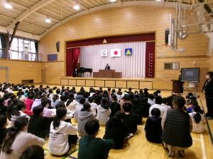 東中学校3年生と全校児童で歌声交流会を行いました。本校5年生と中学3年生がそれぞれ歌唱曲を披露した後、全校で「もみじ」を合唱しました。体育館いっぱいに美しい歌声が響き渡りました。